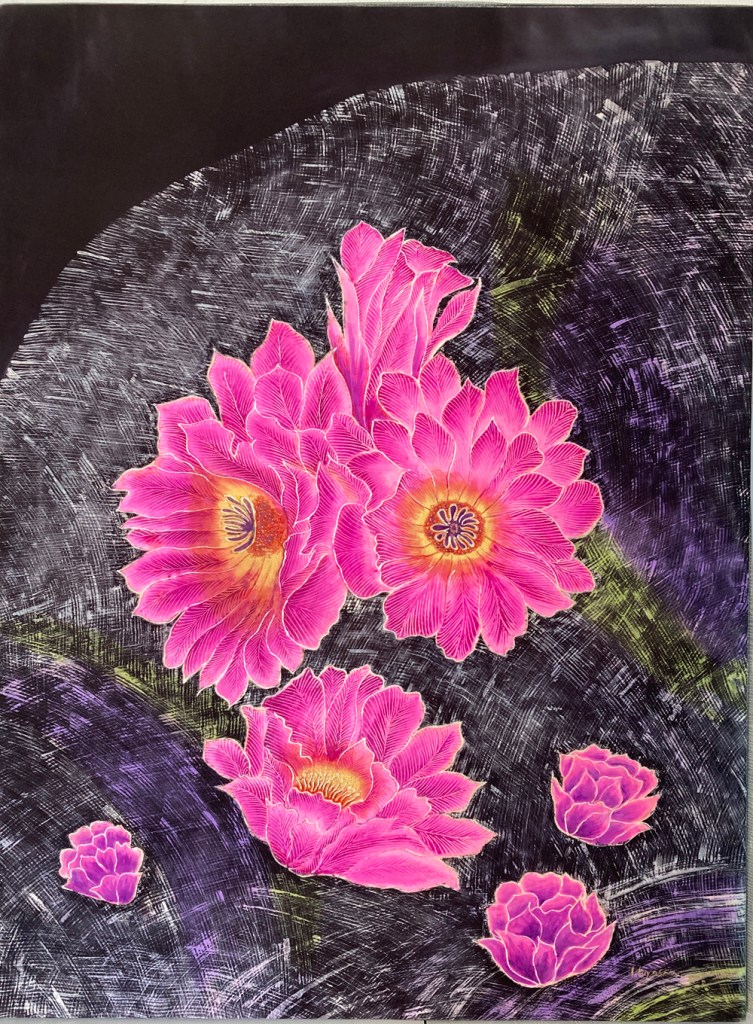 Cactus – Blooming in Dark 闇夜に咲いたカクタス(サボテン)の花Hayashi Setsuko, 40 x 33 inched, Silk, Batik, 2015 Share this: Share on Facebook (Opens in new window) Facebook Share on X (Opens in new window) X Like Loading... Related