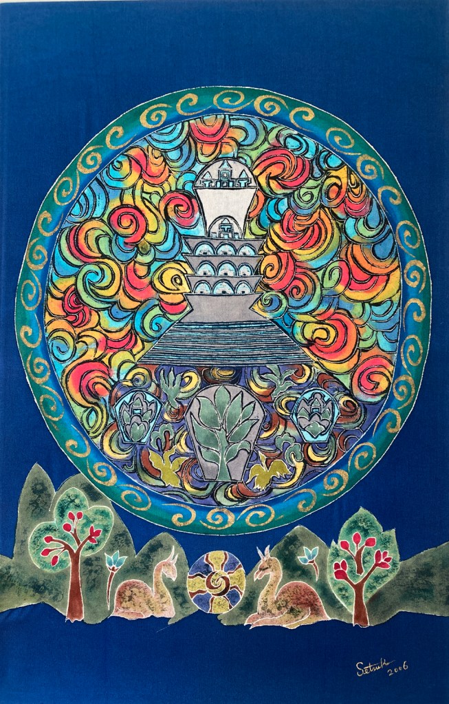 Mandala – House of God 曼荼羅 神の館と砂漠の中の声明Hayashi Setsuko, 51 x 33 inches, Linen, Batik, 2006 Share this: Share on Facebook (Opens in new window) Facebook Share on X (Opens in new window) X Like Loading... Related